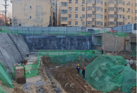 负一层1-3轴垫层浇筑完成,负二层灌注桩桩头剔凿完成50%。
